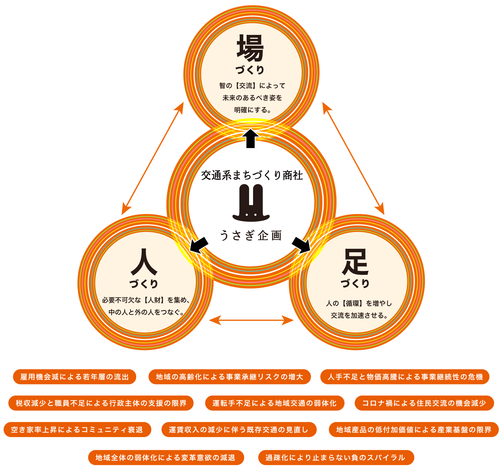 私たちは、人づくり×場づくり×足づくりという3つの側面から、