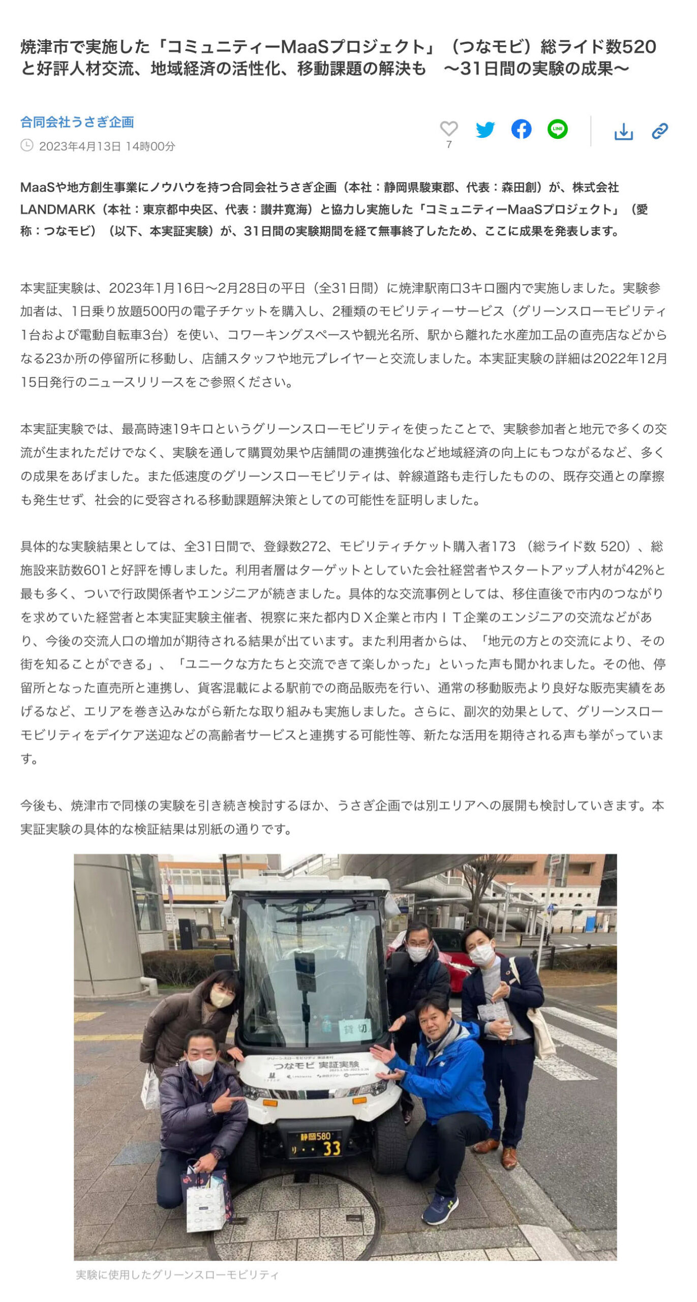 足づくり 焼津市で実施した「コミュニティーMaaSプロジェクト」(つなモビ)総ライド数520と好評人材交流、地域経済の活性化、移動課題の解決も ~31日間の実験の成果~ 2023.04.13 足づくり ニュースリリース
